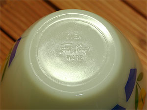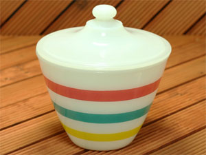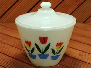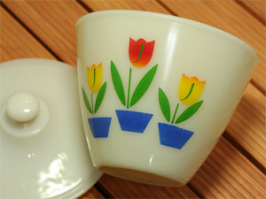 人気のグリースジャー。再入荷しました。本体、フタともに美品です。チューリップの花がずれてプリントされていますが、まあほとんどこのような状態です。アメリカンアンティークのあいまいさとしてご理解いただければ幸いです。