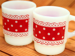 再入荷しました。赤色のレース模様がかわいい人気のマグです。並べてみるとさらにいい感じですよ。