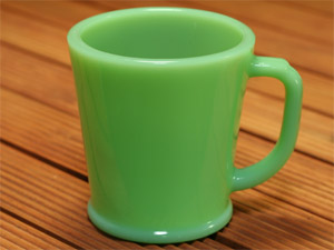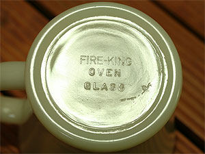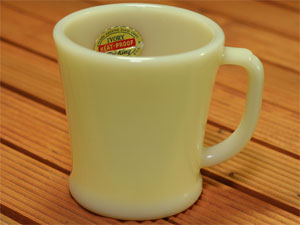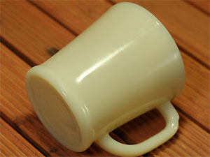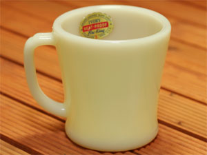 レアなダークアイボリーの初期ブロック体刻印です。1942〜45年製造。ファイヤーキングの中で最も古いものです。ダークアイボリーとしては、やや薄い色目になるかと思われます。ヒビ、カケなし。ツヤあり、リムやボトムにも使用感はありません。コレクターでなくとも一度は手にしてみたいマグカップではないでしょうか。